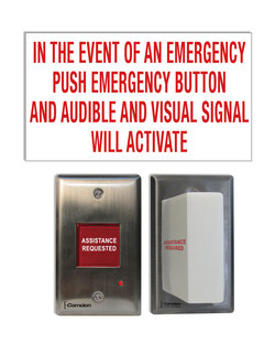 CX-WEC Series emergency call system kits include a range of unique products, specifically designed for this application: CM-450R/12 mushroom push button (Press for Emergency Assistance), CM-AF501SO LED single gang annunciator with sounder (Assistance Requested), CM-AF140SO dome light with sounder (Assistance Required) and code compliant signage, available on vinyl or flame retardant plastic board.