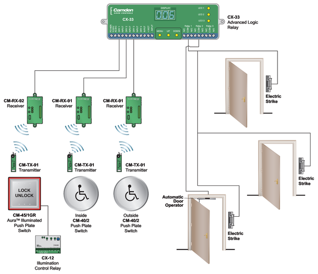 Relay control for the system was also provided by Camden. A CX-33 advanced logic relay was used as the controller for the automatic door, with 3 switch inputs (connected wirelessly) and 3 electric strike outputs. The CX-33 is a 'state of the art' door controller with 14 operating modes, designed to provide 'universal' support for virtually any project. In addition, a CX-12 control relay was used to latch the illumination of the Aura? lock/unlock push plate switch.