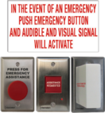 (b) an emergency sign that contains the words ? IN THE EVENT OF AN EMERGENCY PUSH EMERGENCY BUTTON AND AUDIBLE AND VISUAL SIGNAL WILL ACTIVATE" in letters at least 1" (25 mm) high with a 0.2" (5 mm) stroke and that is posted above the emergency button.