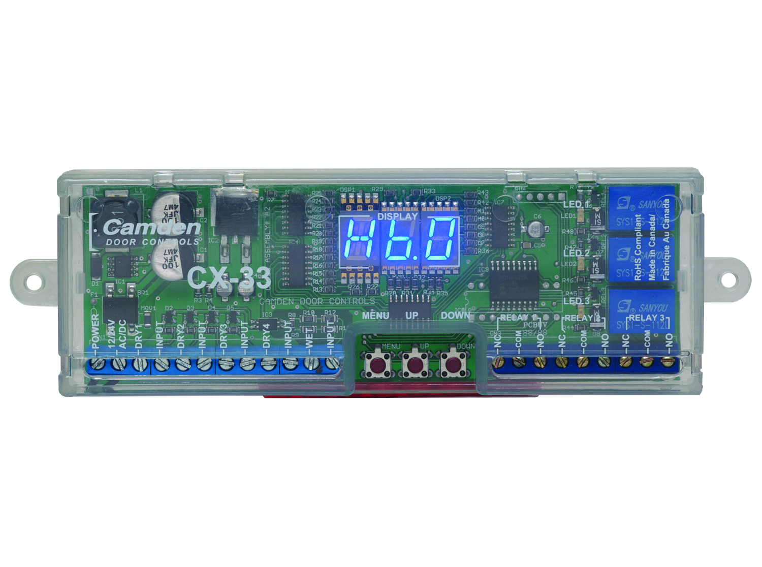Camden's CX-33 is a 'state of the art' logic relay designed to support virtually any automatic door application. The CX-33 features 15 operating modes, with sub-modes, and easy programming with large LCD display and push button selection.