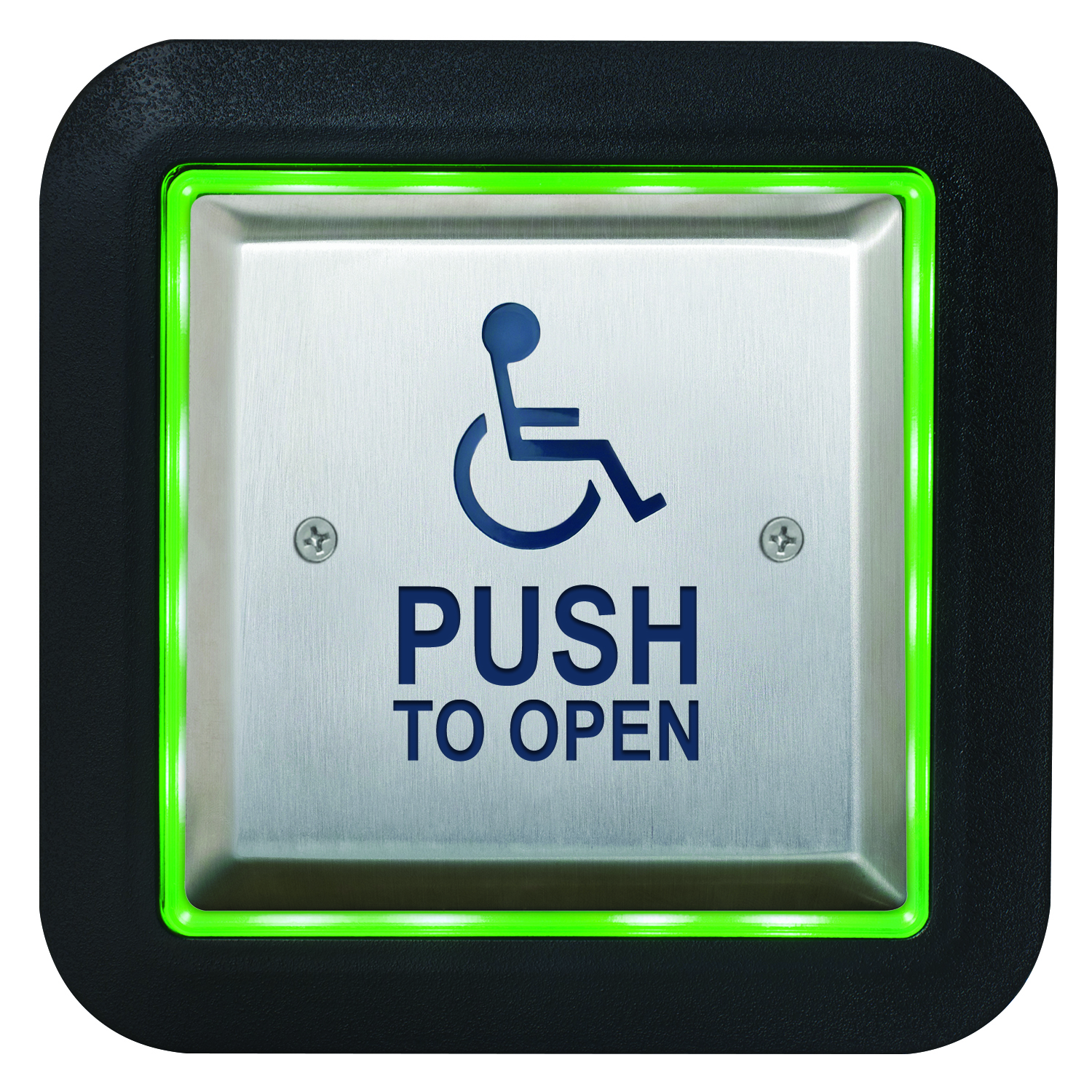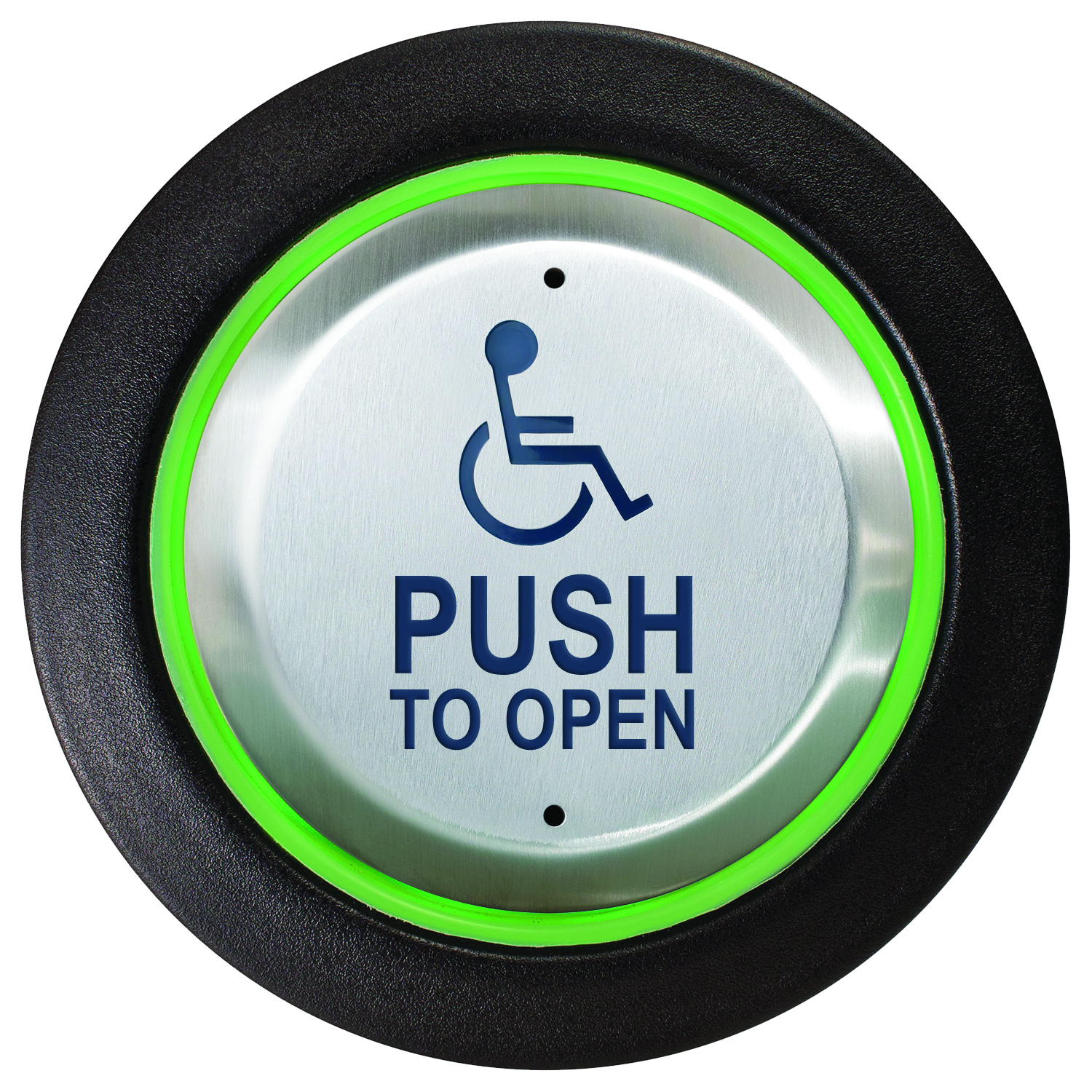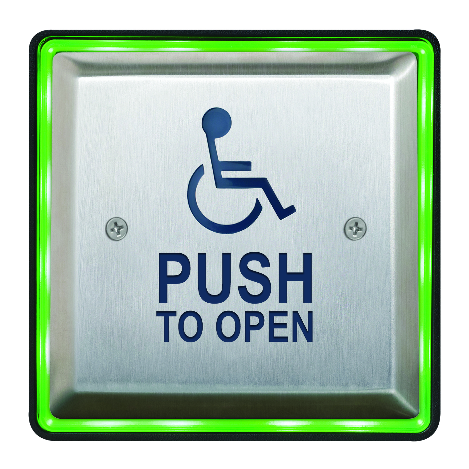 'WHEELCHAIR' symbol and 'PUSH TO OPEN', blue