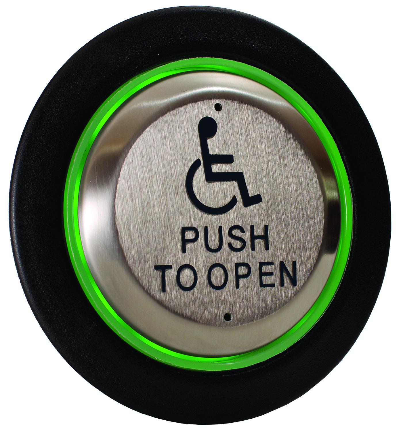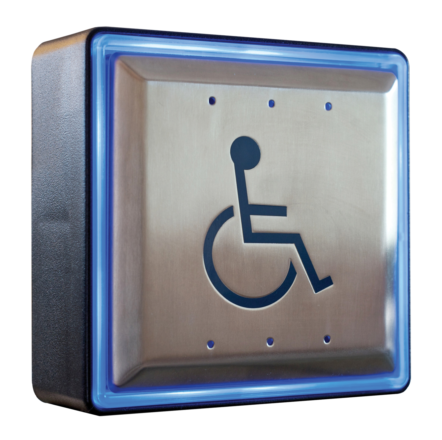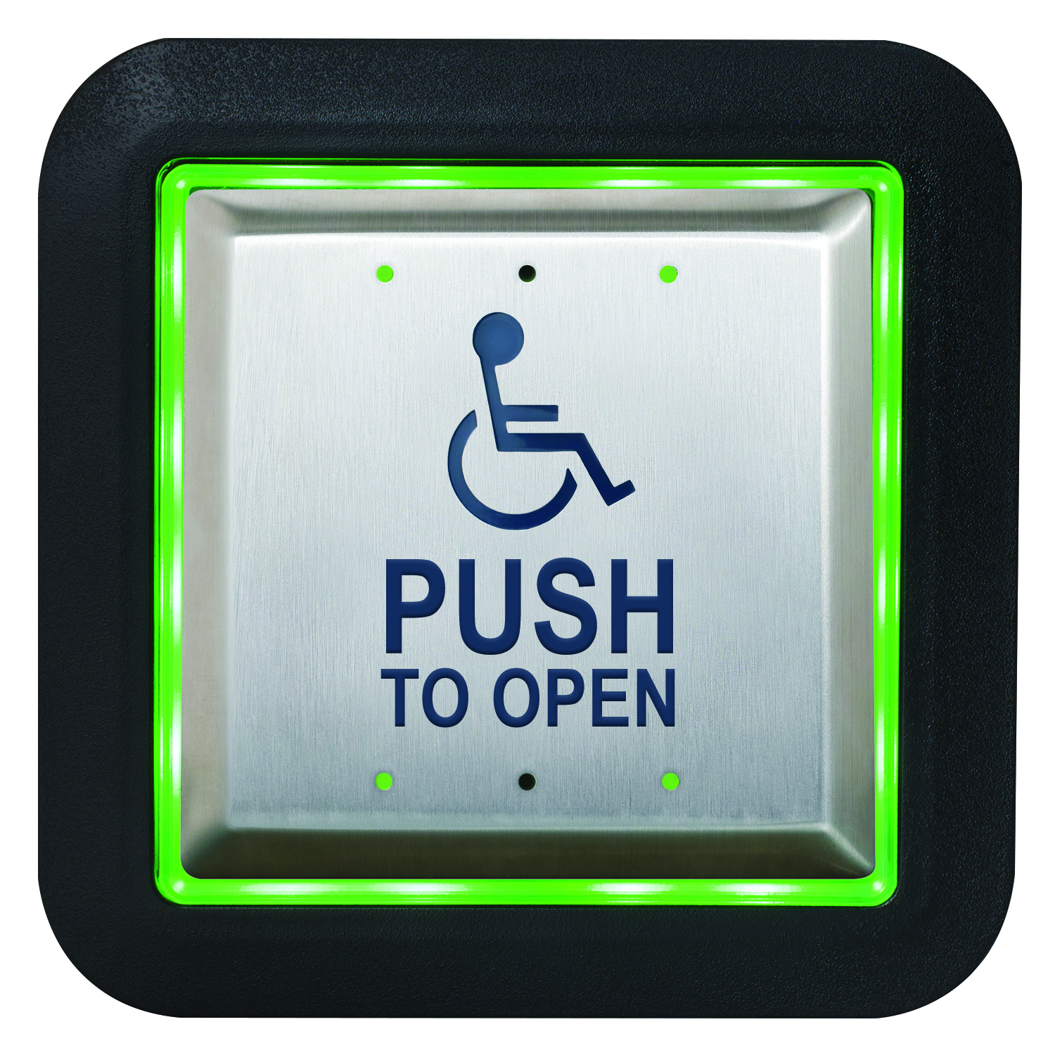 'WHEELCHAIR' symbol and 'PUSH TO OPEN', blue