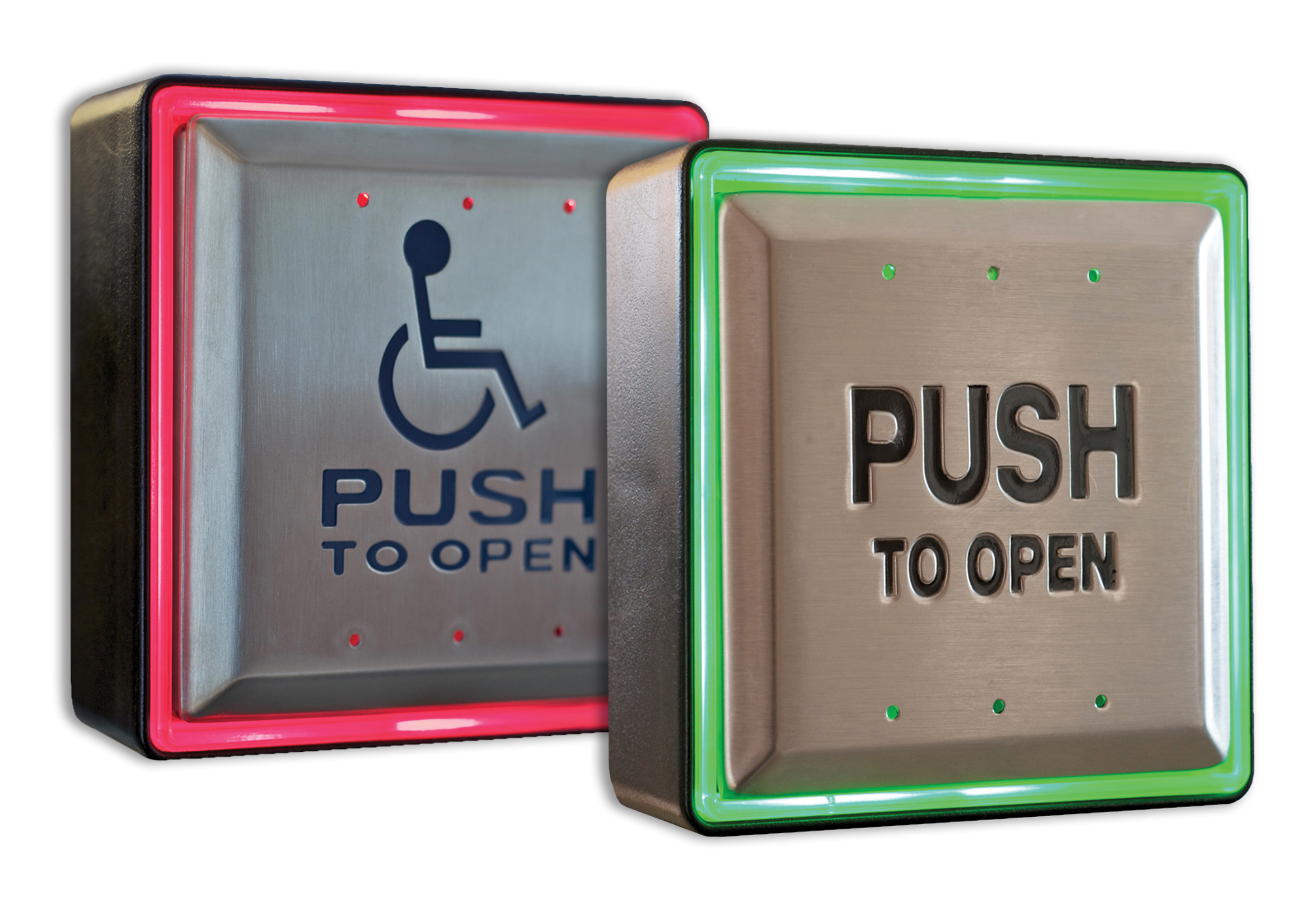 4-1/2" Square push plate (exposed screws), c/w sounder, illuminated RED/GREENBLUE flush mount CM-55i box (not available with /8B graphic option)