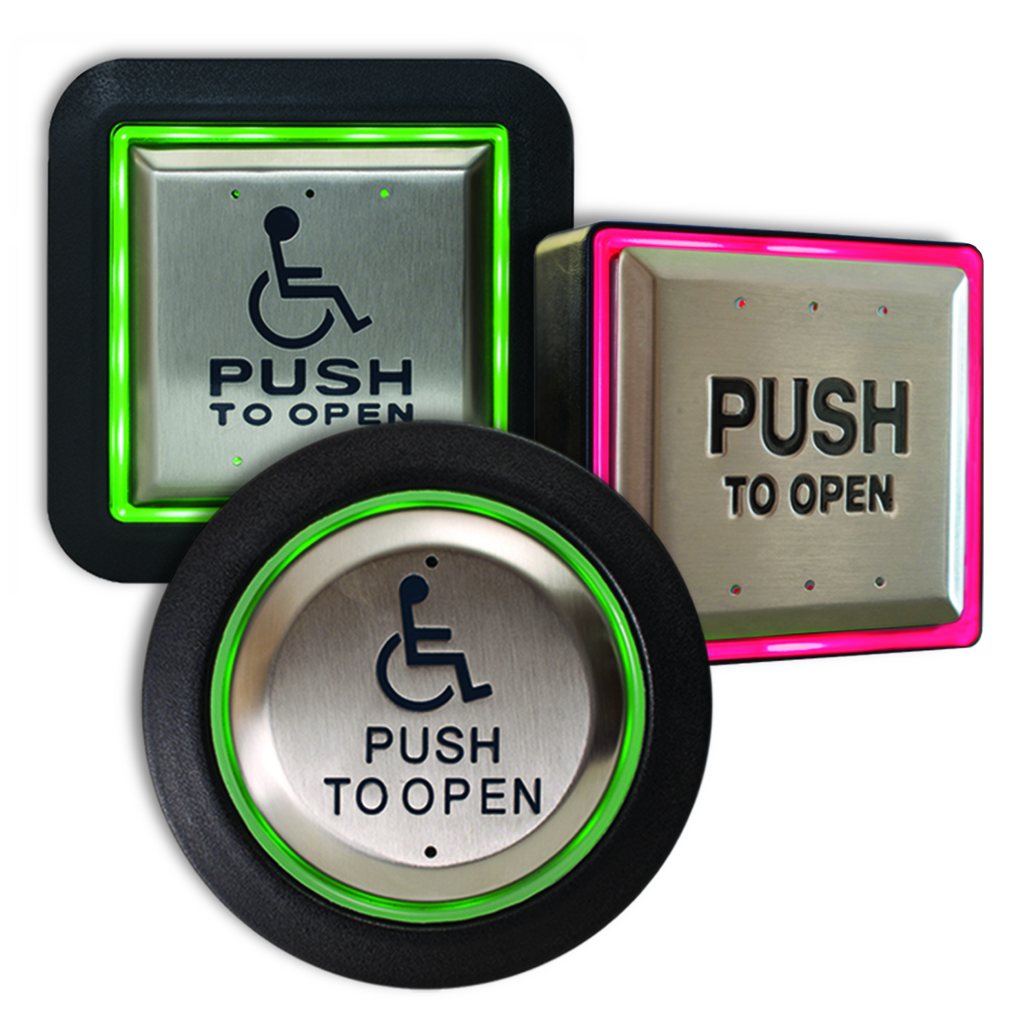 Aura ™ CM-54 (surface square) CM-55 (flush square) and CM-57 (flush round) illuminated push plate enclosures and switch kits provide high visibility and enhanced user convenience in ADA compliant automatic door and other applications.