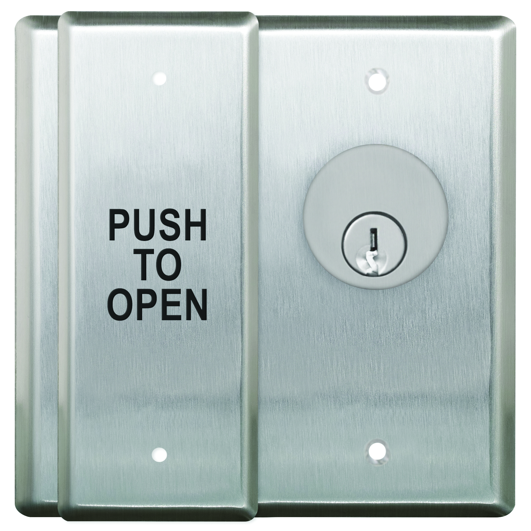 CM-2510 and CM-2520 push plate switches have 4-1/2" x 4-1/2" rectangular faceplates designed for easy installation directly on a double gang electric box. The tubular switches provide virtually silent operation. CM-2510 includes a SPST maintained switch. Mortise cylinder and keys are sold separately.