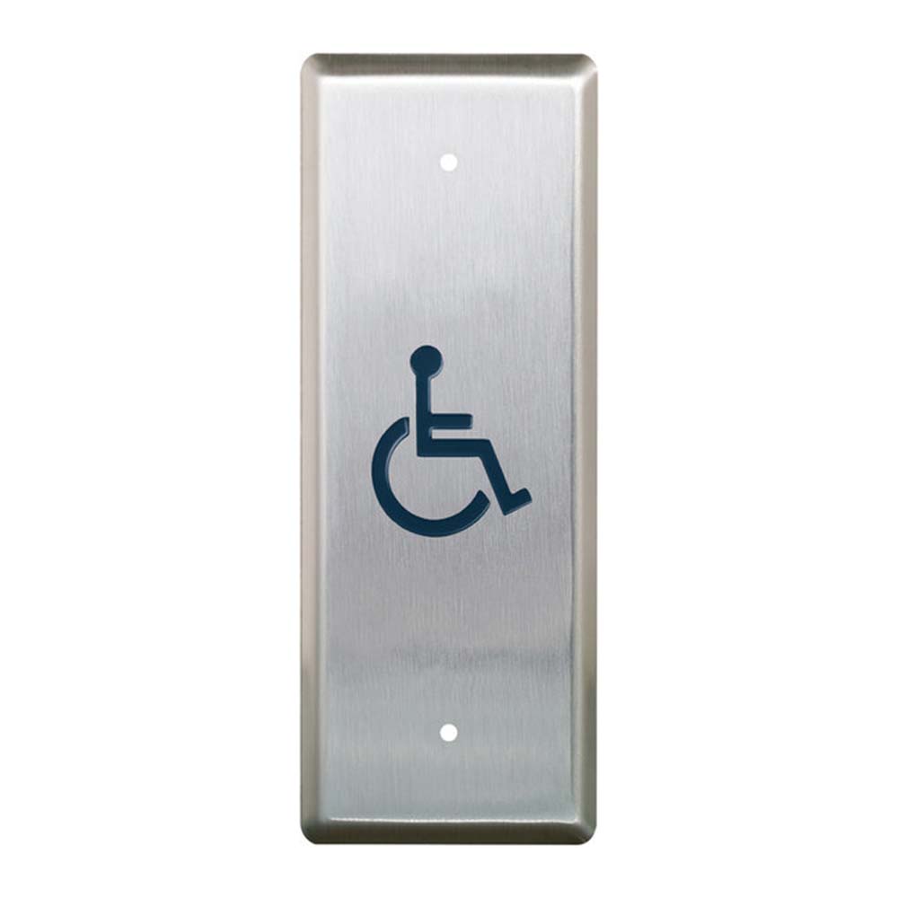 1-3/4" x 4-1/2" (44mm x 114mm) Narrow push plate switch, horizontal mounting. /2 Wheelchair graphic, blue. All other graphic options black only.