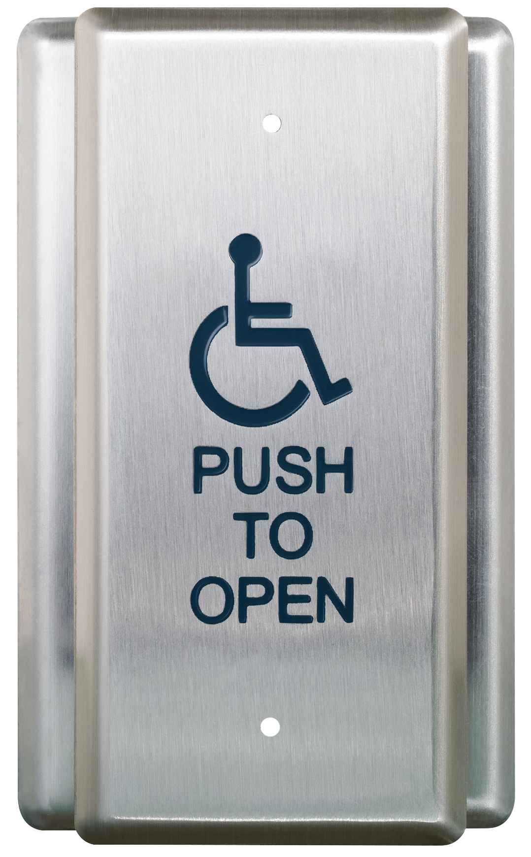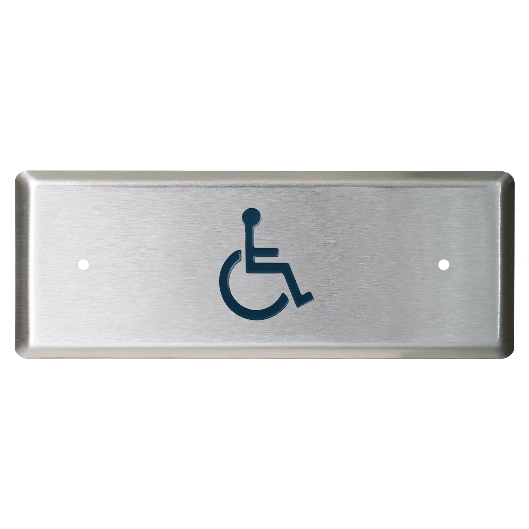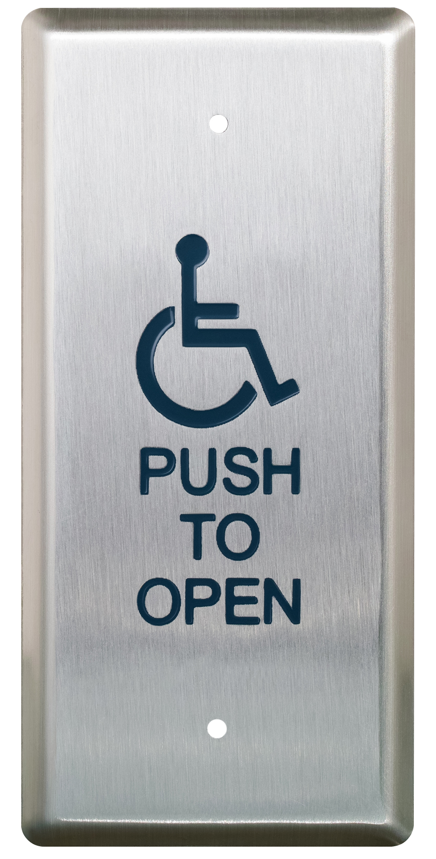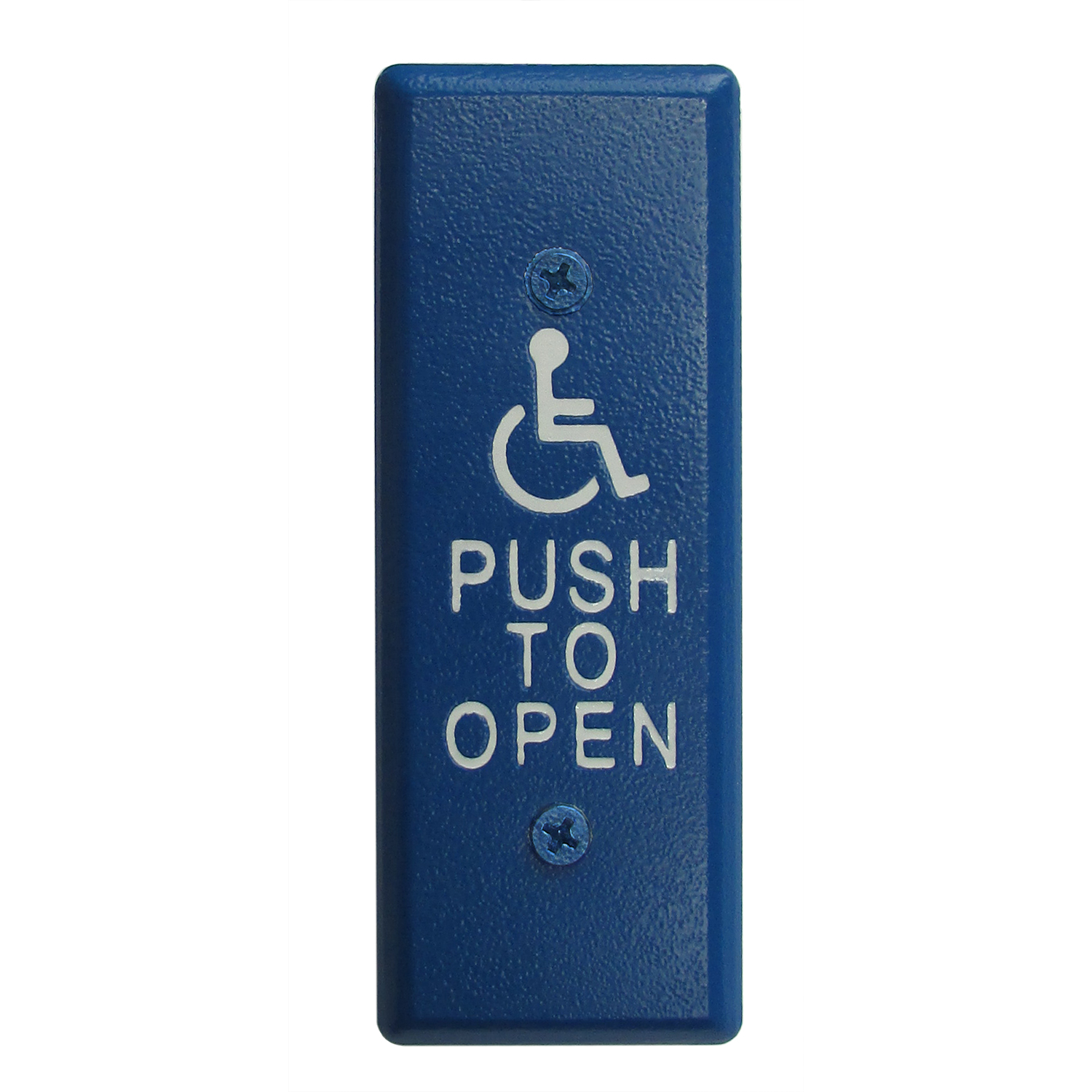 Narrow Blue Push Plate Switch, White Graphics, Exposed Screws. 4-1/2" x 1-3/4" (114mm x 44mm) Graphic Options: '/2' (Wheelchair), '/4' (Wheelchair and Push to Open), & '/A4' (Active Wheelchair and Push to Open) only. No optional finishes.