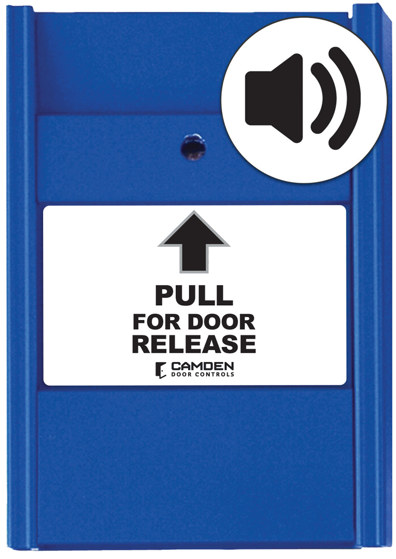 'Universal' blue pull station, (1) N/C - Labels include: (1) 'Pull for Door Release', (1) 'Pull for Emergency Door Release', (1) Eng. and (1) Fr./Eng. bilingual 'Pull in Case of Emergency' & (1) Sp. 'Jale En Caso De Emergencia'