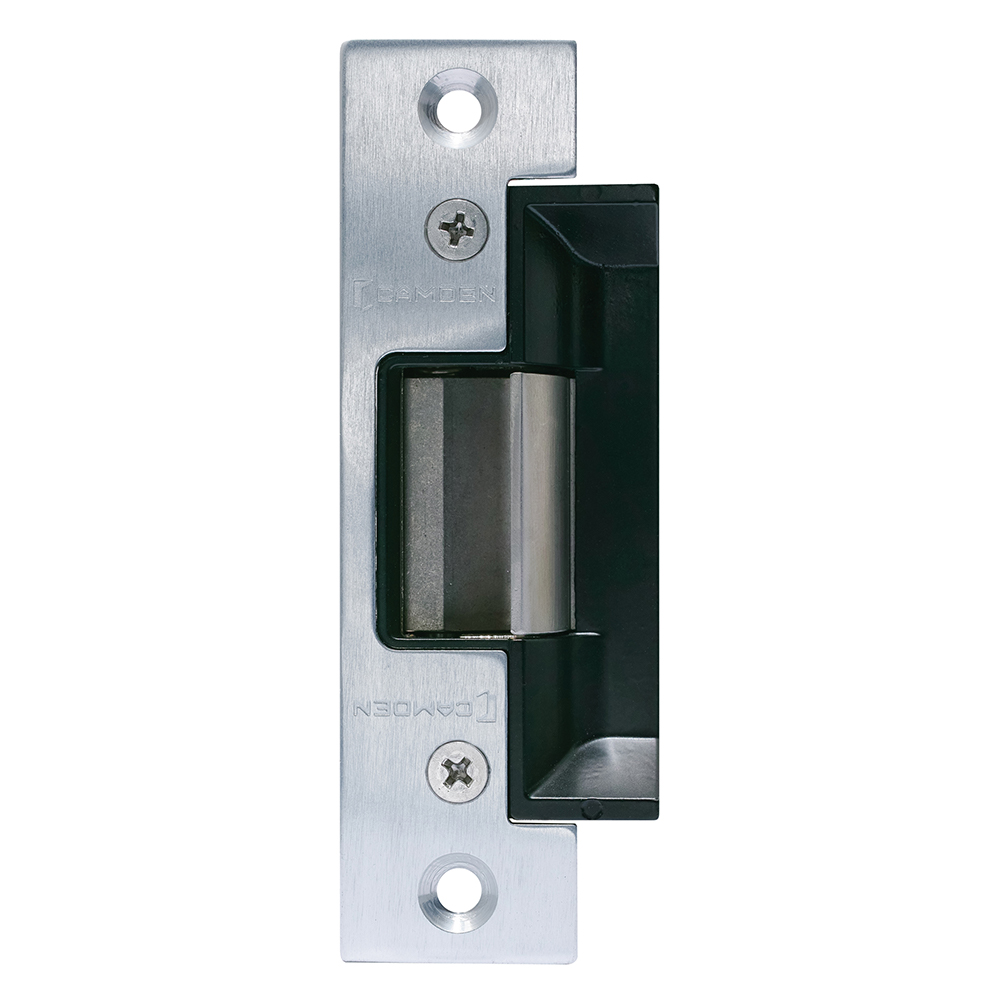 Camden CX-ED1309 Series grade 1 ANSI electric strikes feature 'universal' field selection of 12/24V, AC or DC and fail safe or fail secure operation. They are specifically designed for narrow stile aluminum door frames, typically used for store front retail doors.