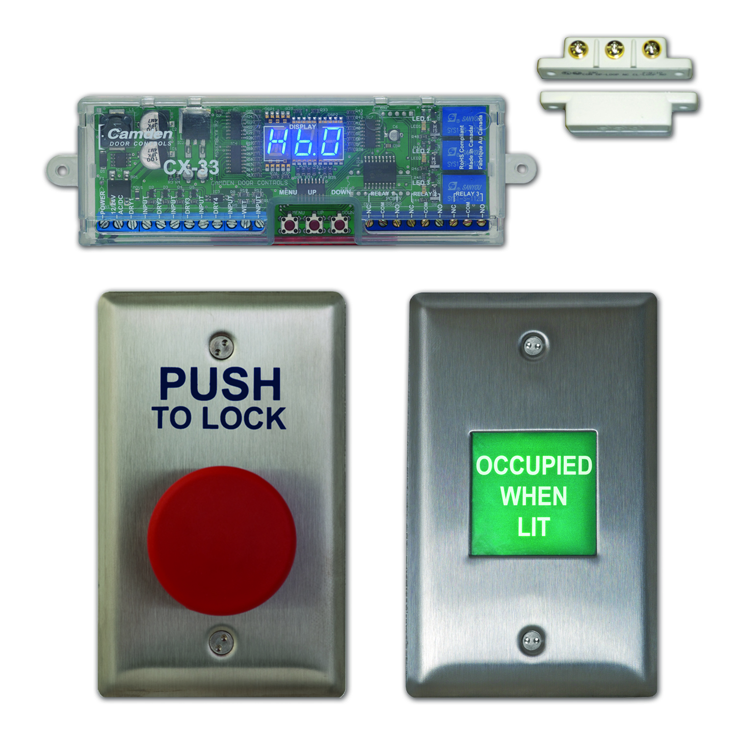 For use without automatic door operator, or with CX-WC 10, 11, 12, 13 & 14 barrier-free restroom control kit. Add suffix 'F' to model number for French language.