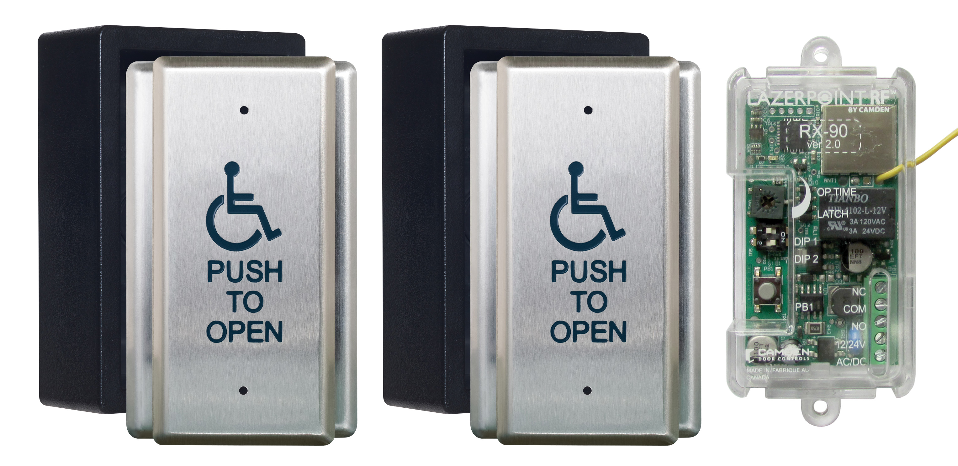 Battery-less wireless transmitter ordered as part of Camden CM-35, CM-40, CM-45, CM-46, & CM-60 Series push plate switches.