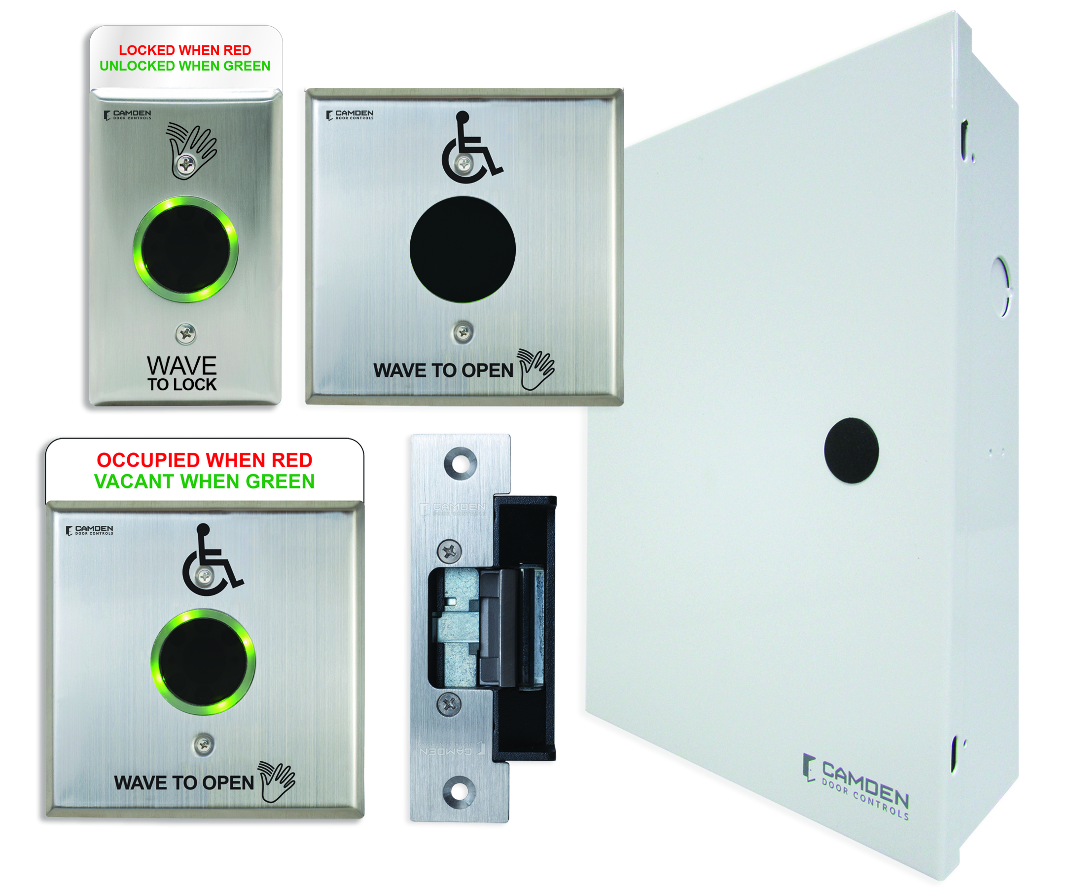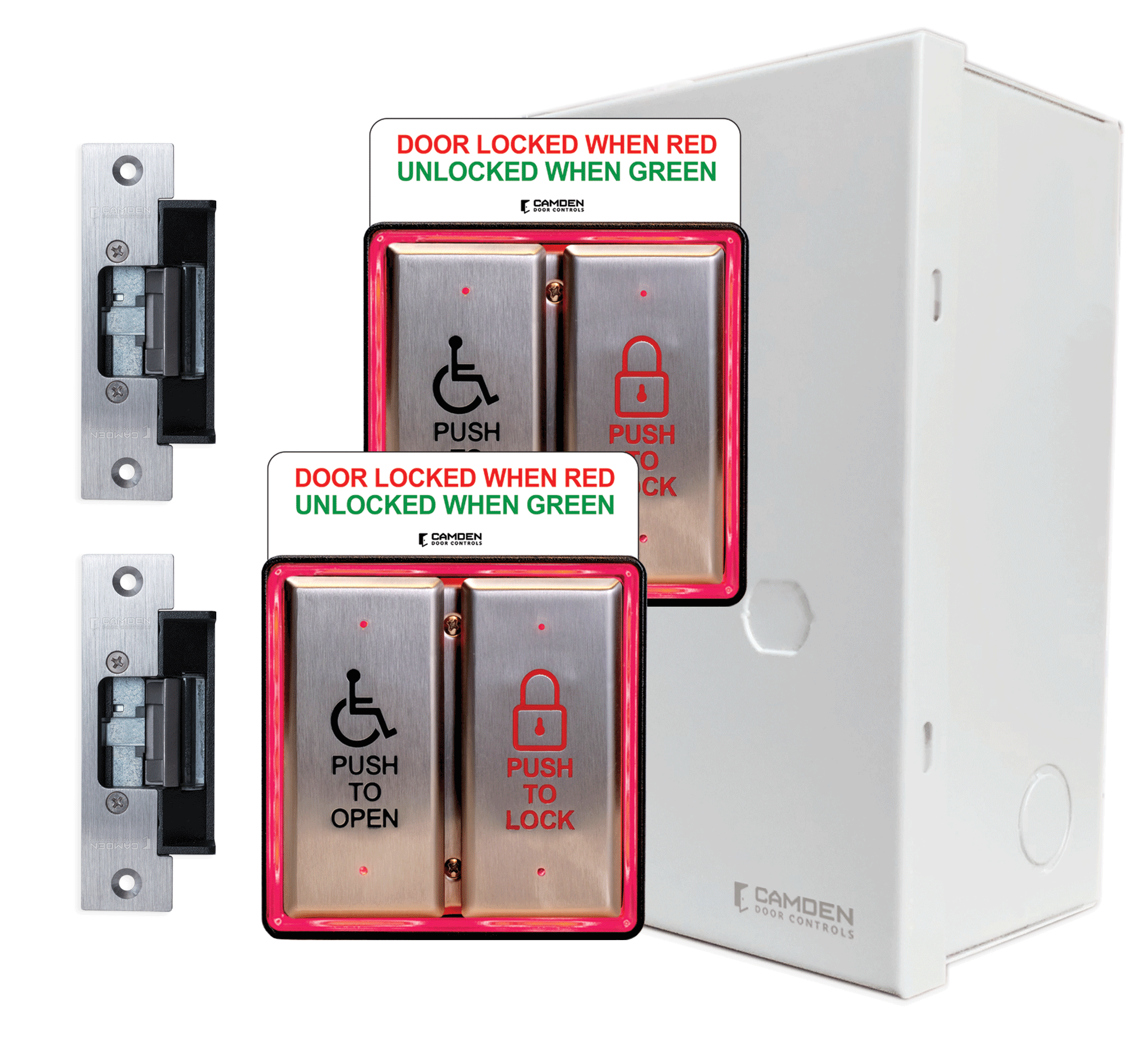 Camden kits also feature exclusive products, including single gang LED annunciators with white-out text, Aura™ illuminated push plate switch enclosures, the option for touchless switches and a pre-wired power supply cabinet.