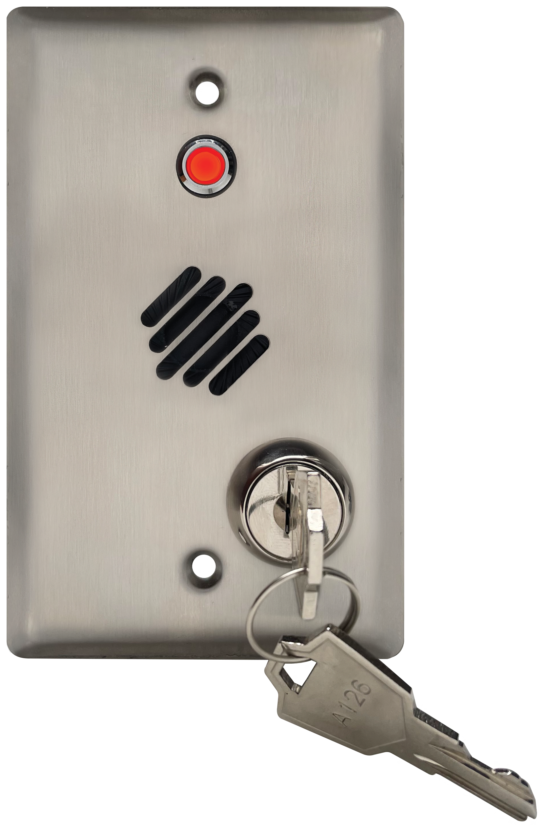Remote Speaker Station with key for both audio and visual distinction. 3 LED color states and 8-ohm speaker for remote messaging.